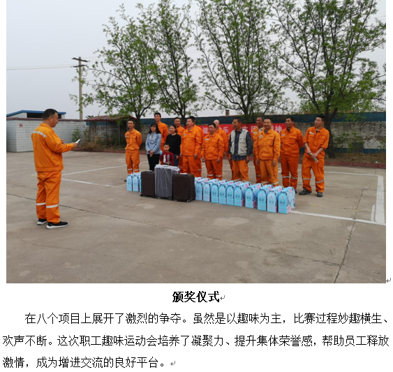 2019職工趣味運動會 為進一步增強職工們的身體素質(zhì),豐富文體生活,增強凝聚力,在“五四”青年節(jié)來臨之際兗州文水分公司、呂梁分公司、中材文水分公司精心籌備,周密策劃的職工趣味運動會,在兗州文水分公司生活區(qū)如期舉行。本次運動會的主題是“以促進友誼為主,貴在人人參與,活躍公司氣氛”。以青年員工為主20多名干部職工參加了本次運動會。通過自娛自樂這種形式,增強團隊合作精神,培養(yǎng)職工熱愛運動,促進身體健康,增強公司凝聚力、戰(zhàn)斗力、號召力的目的。5月6日下午,三個分公司的職工趣味運動會,在經(jīng)理王建立宣讀比賽規(guī)則后拉開了帷幕。此次活動由辦公室人員組織策劃,得到公司大力支持與全體員工的積極配合和參與。本次運動會共設有八個比賽項目: