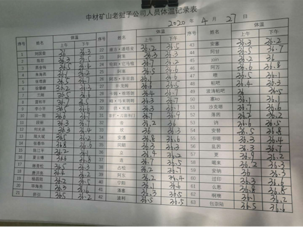根據(jù)老撾衛(wèi)生部2020年4月28日下午2點(diǎn)半的數(shù)據(jù)更新,老撾已經(jīng)連續(xù)16日未出現(xiàn)新的新冠病例,從1月份到4月28日,累計(jì)檢測1815例,累計(jì)排除1796例,累計(jì)確診19例,累計(jì)治愈出院7例,現(xiàn)存12例,11例在萬象150友誼醫(yī)院,1例在瑯勃拉邦省醫(yī)院,均為輕微癥狀。 隨著新型冠狀肺炎在全球蔓延,疫情防控形勢異常嚴(yán)峻,老撾項(xiàng)目部按照公司統(tǒng)一部署,加強(qiáng)領(lǐng)導(dǎo),高度重視,積極應(yīng)對,采取有力措施,確保疫情防控和安全生產(chǎn)工作的順利進(jìn)行。 一、成立疫情期間突發(fā)事件應(yīng)急領(lǐng)導(dǎo)小組,建立健全安全防范工作機(jī)制,明確各小組成員職責(zé)劃分。 按照突發(fā)事件性質(zhì)、機(jī)理和發(fā)生過程分類為突發(fā)聚集性疫情、醫(yī)療防疫物資采購和運(yùn)輸受限、境外項(xiàng)目醫(yī)療防疫物資和生活物資儲備不能滿足需要、醫(yī)療防疫物資和生活物資遭哄搶、中方員工或中外方員工之間發(fā)生群體性事件、項(xiàng)目營地遭恐怖襲擊、人員緊急撤離回國、其他如綁架劫持等八類事件。根據(jù)項(xiàng)目所在地疫情形勢、社會治安狀況、物資供應(yīng)情況等外部條件以及突發(fā)事件的性質(zhì)、嚴(yán)重程度、可控性和影響范圍等因素,將項(xiàng)目疫情突發(fā)事件分為I級(特別重大)、II級(重大)、III級(較大)和IV級(一般)四個級別。并根據(jù)上述四個級別建立對應(yīng)四級響應(yīng)機(jī)制,建立相應(yīng)應(yīng)急預(yù)案并進(jìn)行演練。 二、編制各項(xiàng)應(yīng)急培訓(xùn) 1.項(xiàng)目全員進(jìn)行新冠病毒相關(guān)知識培訓(xùn),確保每人都能熟悉相關(guān)防疫知識。 2.防護(hù)措施、防護(hù)要領(lǐng)培訓(xùn),確保每名員工都能做好自身防護(hù),并充分認(rèn)識到做好自身防護(hù)的重要性。 3.特殊時期安保、安全意識再培訓(xùn),鞏固培訓(xùn)。 4.進(jìn)行各項(xiàng)專項(xiàng)應(yīng)急預(yù)案演練工作。   開展培訓(xùn)學(xué)習(xí) 三、采取各項(xiàng)預(yù)防措施 項(xiàng)目部本著“以人為本、預(yù)防為主、防治結(jié)合”的原則,牢固樹立“全員防疫”的思想意識。通過各種形式和途徑來宣傳疫情影響下可能帶來的突發(fā)事件及應(yīng)對措施。 1.疫情預(yù)防 1.1實(shí)時掌控老撾和項(xiàng)目所在地的疫情增長情況,評估疫情風(fēng)險(xiǎn)。 1.2 疫情初期密切關(guān)注當(dāng)?shù)厣鐣咔榘l(fā)展對物資供應(yīng)所產(chǎn)生的影響,不等不靠,主動作為,利用各類資源多途徑多渠道籌措物資及時儲存足夠防疫、生活物資。 1.3 優(yōu)化各生產(chǎn)工種人員,精簡部分當(dāng)?shù)貑T工、精簡一些非必要崗位且傳播風(fēng)險(xiǎn)高的當(dāng)?shù)貑T工,如食堂幫工、項(xiàng)目駐地清潔工等。 1.4 優(yōu)化現(xiàn)場生產(chǎn)工作流程,減少或避免一些非必要的中方員工與當(dāng)?shù)貑T工接觸交流情況。 1.5 給當(dāng)?shù)貑T工配備口罩、護(hù)目鏡、手套等防護(hù)用品,上下班體溫監(jiān)測。 1.6 項(xiàng)目駐地、辦公場所、生產(chǎn)場所、生產(chǎn)生活車輛設(shè)備等每日定時定點(diǎn)消毒。 1.7 制定項(xiàng)目疫情防控規(guī)定,對防護(hù)物品佩戴、體溫測量、距離保持、聚餐等行為進(jìn)行嚴(yán)格規(guī)范和要求。 1.8加強(qiáng)職工食堂、員工宿舍的衛(wèi)生管理,防止交叉感染。 1.9 當(dāng)?shù)夭少彽纳a(chǎn)生活物資嚴(yán)格執(zhí)行開箱前送貨車輛消毒、開箱后貨物消毒、入庫后再消毒多次全方位消毒措施。   部分雙語宣傳頁   部分防疫物資  體溫記錄表 2.其他突發(fā)事件預(yù)防 2.1以適當(dāng)?shù)那罍贤üこ膛従用耜P(guān)系。尊重當(dāng)?shù)貑T工,平等相待,和睦共處;人員雇傭時,要兼顧所在地各社區(qū)利益,避免社區(qū)麻煩。項(xiàng)目駐地嚴(yán)格實(shí)行封閉管理制度,非上下班期間,禁止任何人員外出駐地。 2.2建立并保持與工程項(xiàng)目所在地政府機(jī)構(gòu)、治安機(jī)構(gòu)的聯(lián)系渠道。 2.3關(guān)注工程所在地和毗鄰地區(qū)社會治安動向。發(fā)現(xiàn)工地、駐地周邊有可疑情況,及時采取應(yīng)對措施并向我國使(領(lǐng))館和當(dāng)?shù)卣畧?bào)告。 2.4 精簡當(dāng)?shù)貑T工時,并就工資、勞工補(bǔ)償?shù)冗_(dá)成協(xié)議,避免當(dāng)?shù)貑T工出現(xiàn)群體性事件。 2.5礦山增加夜間照明設(shè)備,安排人員24小時值班,防止偷盜、搶劫等。 2.6與員工開展談心活動,穩(wěn)定員工的思想和情緒;項(xiàng)目部領(lǐng)導(dǎo)和安全主管要定期或不定期與當(dāng)?shù)毓蛦T、司機(jī)交流,了解其思想動態(tài),一旦發(fā)現(xiàn)有不好的苗頭,應(yīng)立即采取措施。 2.7告誡司機(jī)無特殊情況上下班中途不準(zhǔn)停車,不準(zhǔn)搭載其他人乘車。要求司機(jī)定期檢查車輛狀況,發(fā)現(xiàn)問題及時報(bào)告處理,不允許車輛帶病行駛。 2.8完善生活區(qū)安防設(shè)施,增加攝像頭、夜間照明、加固圍欄鐵絲網(wǎng)。 2.9為境外人員購買合適的海外人身意外傷害保險(xiǎn)。 四、應(yīng)急社會資源及物資采取措施 1.建立并保持中國駐老撾大使館的溝通渠道。 2.建立并保持與項(xiàng)目部所在地的疾控中心、衛(wèi)生機(jī)