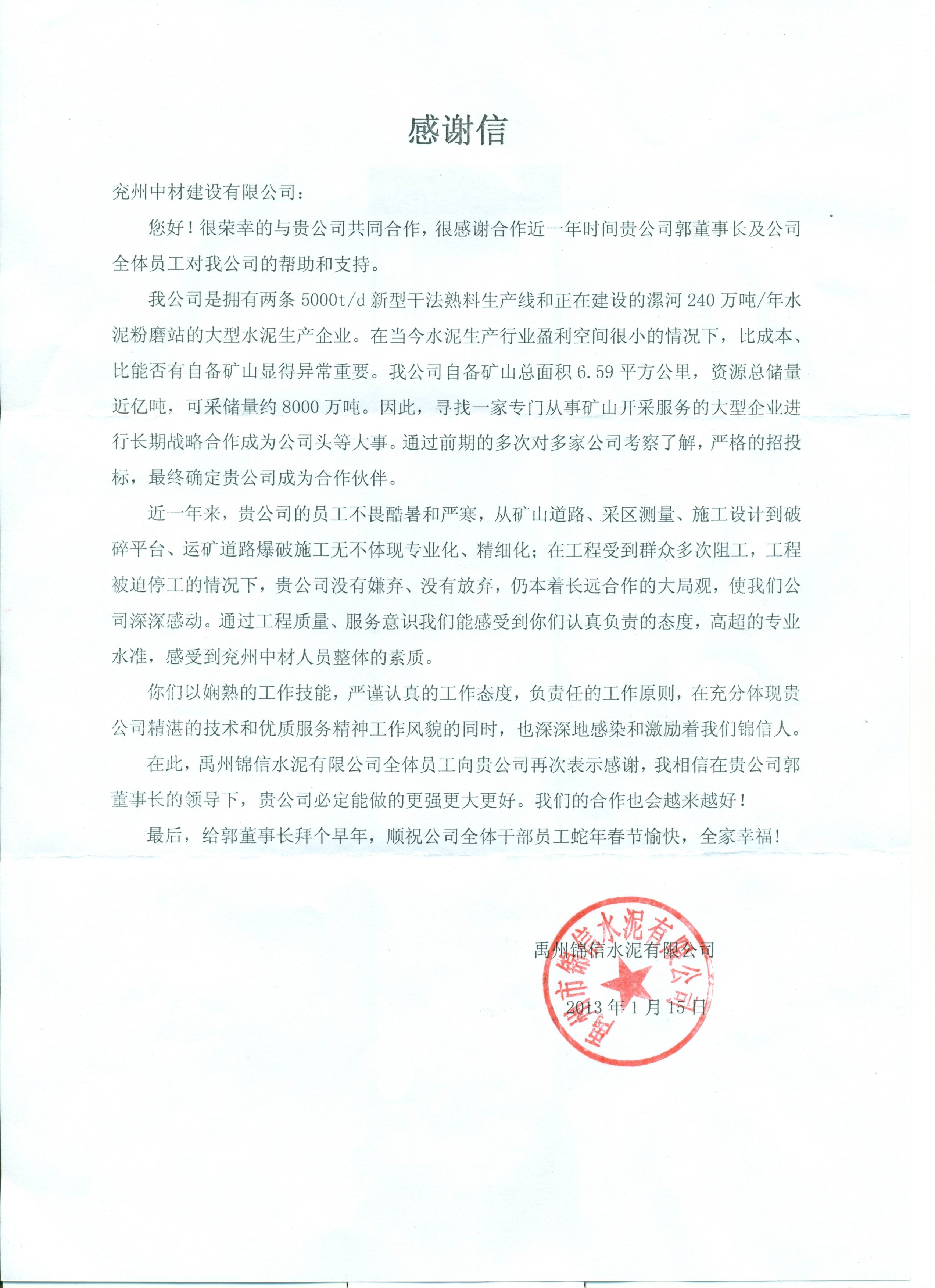 禹州市錦信水泥有限公司感謝信