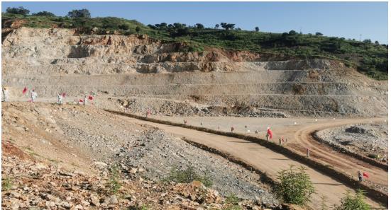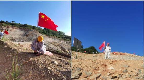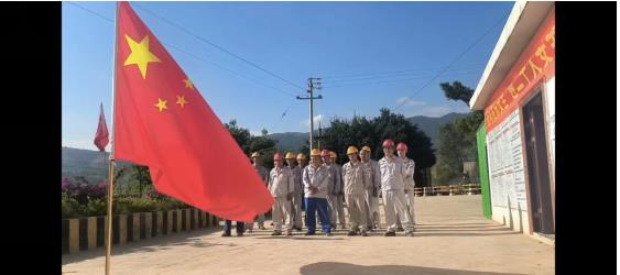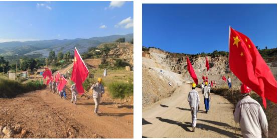 唱完國(guó)歌,員工們?cè)陧?xiàng)目經(jīng)理及各黨員的帶領(lǐng)下,每人領(lǐng)取了一面國(guó)旗和旗桿,興致勃勃的向礦區(qū)走去。